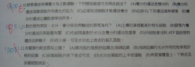 10.(A) 養分運送不是雙向的嗎? ,(E) 主動運輸的部分不是只有伴細胞將蔗糖送至篩管內,而篩管內流動是因為壓力流,為什麼會跟主動運輸有關??