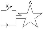 孝剛把一柔軟導線彎成星形電路如下圖,並將此電路置於光滑水平桌上。當孝剛按下開關K時,電路會有何變化? (A)會變形使A角變小,所圍面積變小 (B)會變形使A角變小,所圍面積變大 (C)會變形使A角變大,所圍面積變小 (D)會變形使A角變大,所圍面積變大