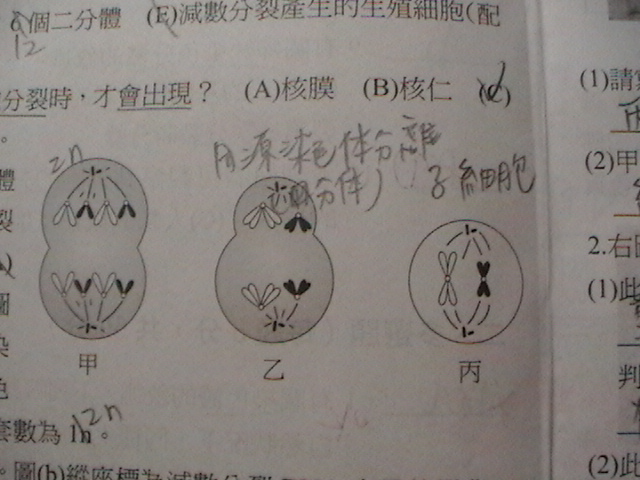 (B) 丙圖正在進行有絲分裂 (C)甲圖的染色體套數為4n (D)乙圖的染色體套數為2n (E)丙圖