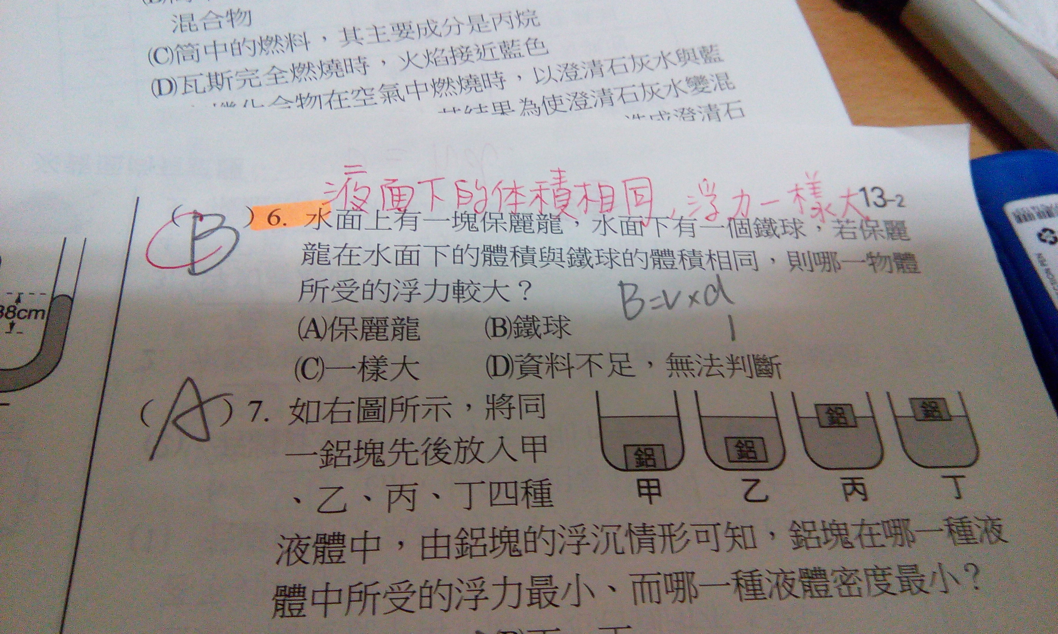第6題.保麗龍不是浮體嗎?浮體浮力不是應等於本身重?那又該如何和鐵球做比較