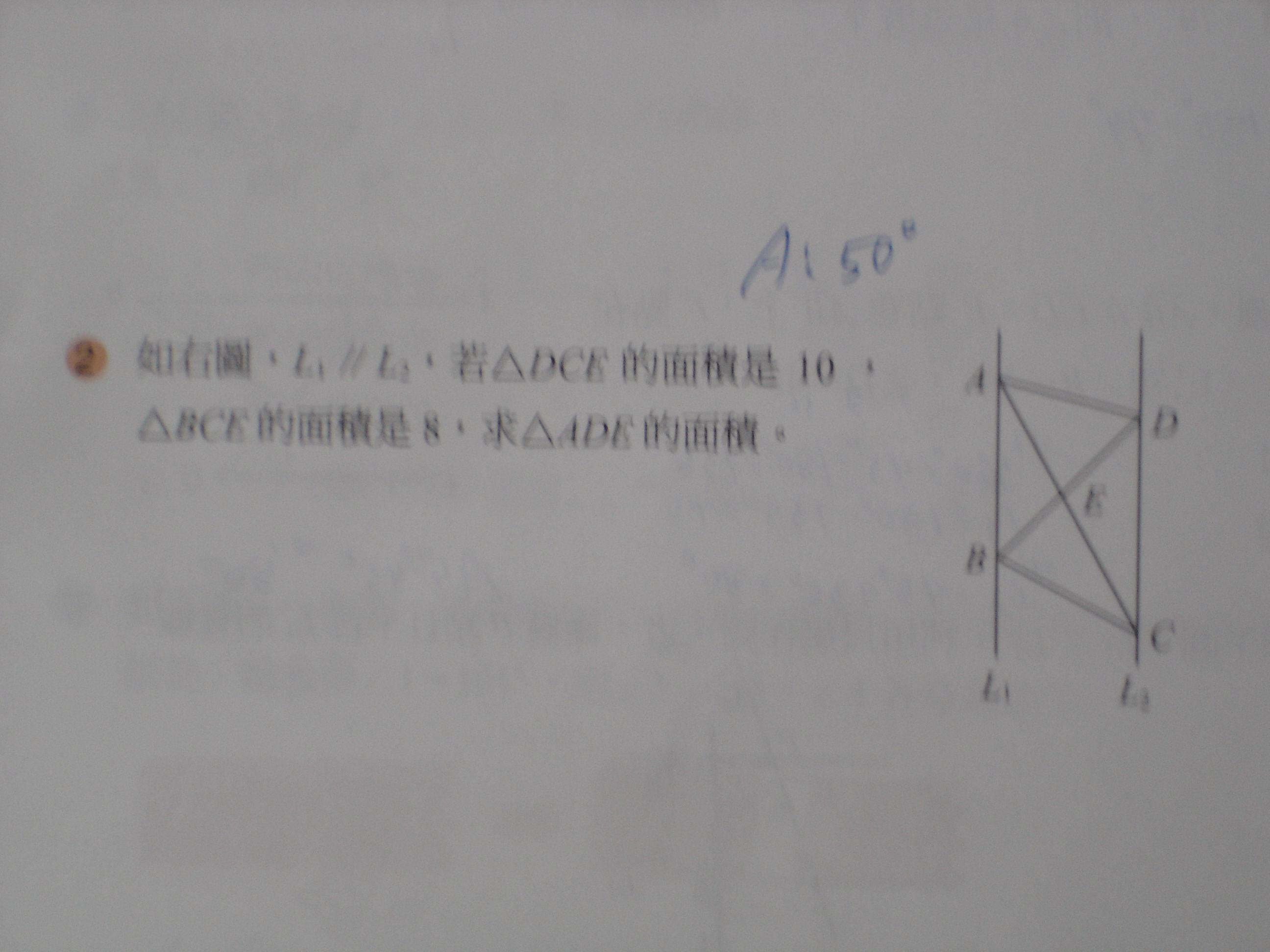 L1//L2,若三角形DCE的面積是10,三角形BCE的面積是8,求三角形ADE的面積